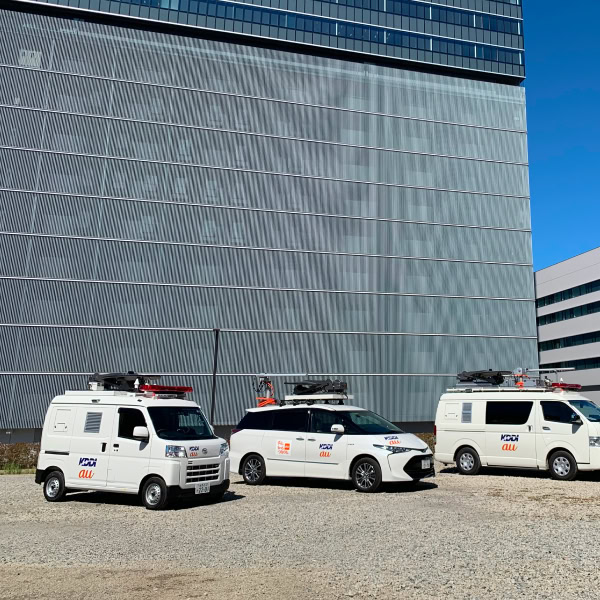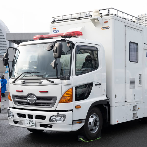 Vehicle-mounted base station: A system installed on vehicles to provide temporary connectivity on-site as a substitute for damaged base stations during disasters. First introduced by KDDI in 2006, this solution has now been miniaturized to the size of a compact car.
